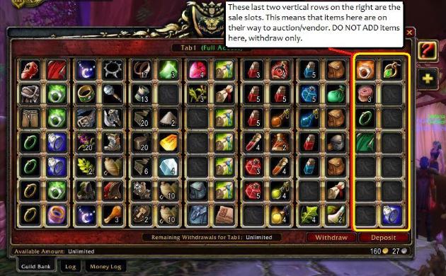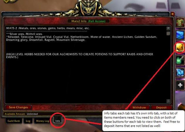 | Guild Bank First and foremost, the guild bank is the creation of its members, therefore what happens with the money and items donated will ultimately be decided by the members. Thanks to the generous donation of our members, we've had our first guild bank slot within the first week of creating the guild! That says a lot considering when we first started the guild, only a handful of members were moderate level! Currently, no one has access to withdraw donated money (the GM does not touch the money either.) What happens with the money will be decided by its members at meetings. At this time the money is being put towards buying out remaining tabs. The bank system supports gearing, events such as raids, leveling professions, fun events (such as birthdays, holidays, and occasional raffle prizes). We can not support helping individual members with mount and repair money. Members are expected to support their own repair and mount costs. Guild gold is spent for the good of the whole guild, though any items may be used to improve individual toons and their professions. Occasional Raffles and Rolls may be held for Blue and Purple (Rare or Epic) donated items that are not needed by guild members, and to hold fund raisers when needed. The rules of the bank are as follows: 1. Access and Rights: All official members have FREE access to guild items. From tabs top to bottom: (gear, mats 1, mats 2, consumables) Initiated members have access to withdraw 1,2,2,1 items per day, Soldiers 2,3,3,2. Veteran soldiers and Officers 3,5,5,3. Recruits can make money or item deposits, but do not have access to remove items. Items are for guild members only. This is to protect the time, dedication and donations of loyal members. Abuse of this trust goes against the Guild Pledge and guild rules, and individuals abusing the bank may have their privileges removed . 2. Guidelines for deposits: Try to make periodic donations in items and money to the bank as you go along. Donate how much you are happy and comfortable with. Check the "INFO" tabs, each tab has it's own list (refer to picture 2) Listed there will be items that members NEED and are asking for. Feel free to deposit items that aren't listed as well. Please avoid depositing "grey" items unless it has a vendor value of at least ONE GOLD. If a grey item is deposited it will be immediately sold to a vendor and the money will be deposited to the bank. The GM will remove items that have been sitting the bank for a while. (Refer to rule number 4 for more details.) Deposit blue, purple, or other very valuable items in the *Rare and Epics" Tab. Withdrawal from this tab is restricted from all members to prevent abuse and selling of these items and in case there is competition for the item. All members have to do to receive these items is ask the GM for it and she will send it to you. If there is competition for the item, the GM will simply have the members who want the item to /roll for it. 3. Guidelines of Withdrawals: Items in the guild bank are donation based, and are expected to go to guild members only. Members may remove any item(s) they can use. Members may not sell items withdrawn from the bank. The only exception to this rule is that if you use mats to level a profession, and decide to sell some of the items you've created. Our guild also supports the use of mats in the guild bank for leveling professions, (please refer below for disenchanting.) We ask that you make a decision to keep the profession before removing the mats and donate some of the items crafted back into the bank or donate money – a donation in return is suggested, but not required. What you donate to the bank will be entirely up to you. Mats will not be removed for sale by the GM (with exception to rare circumstances.) Cloth mats may NOT be removed to earn city rep for mounts! Enchanting proffesionals: Items in the last two vertical rows may also be used for disenchanting if it will level your enchanting or provide guild members with enchants appropriate for their level. Removing items beyond this for disenchanting may be considered abuse of the guild bank. 4. Managing items in excess: Do not add any items in the right two vertical rows of the bank slots (refer to picture 1. below) This will be the sole responsibility of the GM to remove items in excess or items that will not be used by members in the near future. This is to clear the bank of some space and for the financial gain of the guild. The GM will remove items that have been sitting in the bank for a while, and the items in question for removal will be placed in the last two right vertical rows of each bank tabs, so that members may have a chance to withdraw them if needed before being sold. Before the GM sells these items, she may ask those who can directly benefit from the item in question for removal if they would like it. For example a level 21 staff with intellect stats has been sitting in the bank for over a week – the GM will ask any appropriate class levels 15-25 that can benefit from a staff with intellect stats if they want the item. If no one needs the item, it will be placed in the last two vertical slots and will be sold to a vendor or auctioned off. The money made will be put directly back into the bank. Since the items in those slots are for sale and not needed by members, recruits may purchase them for at least vendor value. Items in the last two vertical rows may also be used for disenchanting (please read "3. Guidelines of withdrawals" before proceeding to do so. Picture 1. Picture 2. |