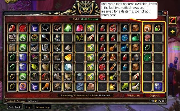 Guild Bank First and foremost, the guild bank is the creation of its members, therefore what happens with the money and items donated will ultimately be decided by the members. Thanks to the generous donation of our members, we've had our first guild bank slot within the first week of creating the guild! That says a lot considering when we first started the guild, only a handful of members were moderate level! Currently, no one has access to withdraw donated money (the GM does not touch the money either.) What happens with the money will be decided by its members at meetings. At this time the money is being put towards buying out remaining tabs. The bank system supports gearing, events such as raids, leveling professions, fun events (such as birthdays, holidays, and occasional raffle prizes). We can not support helping individual members with mount and repair money. Members are expected to support their own repair and mount costs. Guild gold is spent for the good of the whole guild, though any items may be used to improve individual toons and their professions. Occasional Raffles and Rolls may be held for Blue and Purple (Rare or Epic) donated items that are not needed by guild members, and to hold fund raisers when needed. The rules of the bank are as follows: 1. Access and Rights: All official members have FREE access to guild items. From tabs top to bottom: (gear, mats 1, mats 2, consumables) Initiated members have access to withdraw 1,2,2,1 items per day, Soldiers 2,3,3,2. Veteran soldiers and Officers 3,5,5,3. Recruits can make money or item deposits, but do not have access to remove items. Items are for guild members only. This is to protect the time, dedication and donations of loyal members. Abuse of this trust goes against the Guild Pledge and guild rules, and individuals abusing the bank may have their privileges removed . 2. Guidelines for deposits: Try to make periodic donations in items and money to the bank as you go along. Donate how much you are happy and comfortable with. Check the "INFO" tabs, each tab has it's own list (refer to picture 2) Listed there will be items that members NEED and are asking for. Feel free to deposit items that aren't listed as well. Please avoid depositing "grey" items unless it has a vendor value of at least ONE GOLD. If a grey item is deposited it will be immediately sold to a vendor and the money will be deposited to the bank. The GM will remove items that have been sitting the bank for a while. (Refer to rule number 4 for more details.) Deposit blue, purple, or other very valuable items in the *Rare and Epics" Tab. Withdrawal from this tab is restricted from all members to prevent abuse and selling of these items and in case there is competition for the item. All members have to do to receive these items is ask the GM for it and she will send it to you. If there is competition for the item, the GM will simply have the members who want the item to /roll for it. 3. Guidelines of Withdrawals: Items in the guild bank are donation based, and are expected to go to guild members only. Members may remove any item(s) they can use. Members may not sell items withdrawn from the bank. The only exception to this rule is that if you use mats to level a profession, and decide to sell some of the items you've created. Our guild also supports the use of mats in the guild bank for leveling professions, (please refer below for disenchanting.) We ask that you make a decision to keep the profession before removing the mats and donate some of the items crafted back into the bank or donate money – a donation in return is suggested, but not required. What you donate to the bank will be entirely up to you. Mats will not be removed for sale by the GM (with exception to rare circumstances.) Cloth mats may NOT be removed to earn city rep for mounts! Enchanting proffesionals: Items in the last two vertical rows may also be used for disenchanting if it will level your enchanting or provide guild members with enchants appropriate for their level. Removing items beyond this for disenchanting may be considered abuse of the guild bank. 4. Managing items in excess: Do not add any items in the right two vertical rows of the bank slots (refer to picture 1. below) This will be the sole responsibility of the GM to remove items in excess or items that will not be used by members in the near future. This is to clear the bank of some space and for the financial gain of the guild. The GM will remove items that have been sitting in the bank for a while, and the items in question for removal will be placed in the last two right vertical rows of each bank tabs, so that members may have a chance to withdraw them if needed before being sold. Before the GM sells these items, she may ask those who can directly benefit from the item in question for removal if they would like it. For example a level 21 staff with intellect stats has been sitting in the bank for over a week – the GM will ask any appropriate class levels 15-25 that can benefit from a staff with intellect stats if they want the item. If no one needs the item, it will be placed in the last two vertical slots and will be sold to a vendor or auctioned off. The money made will be put directly back into the bank. Since the items in those slots are for sale and not needed by members, recruits may purchase them for at least vendor value. Items in the last two vertical rows may also be used for disenchanting (please read "3. Guidelines of withdrawals" before proceeding to do so. Picture 1. Picture 2. |